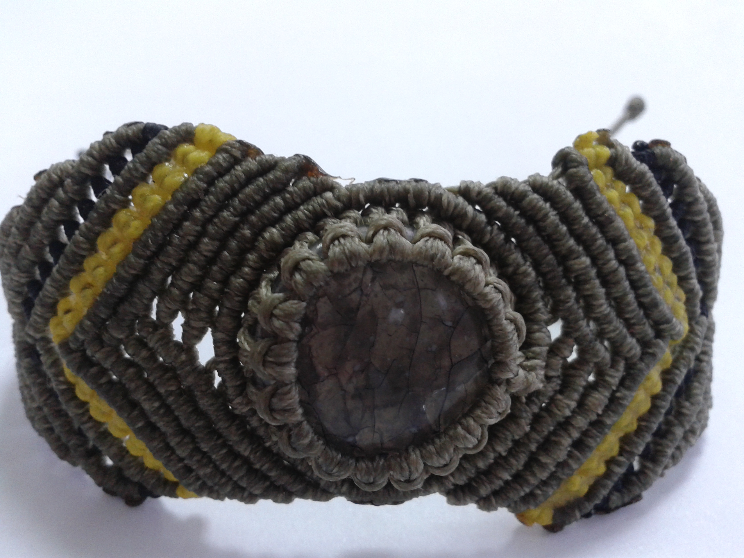 Βραχιόλι macrame φταιαγένο με συνθετική πέτρα μαύρο-γκρι και κηροκλωστή σε χρώματα λαδί, κίτρινο και μαύρο